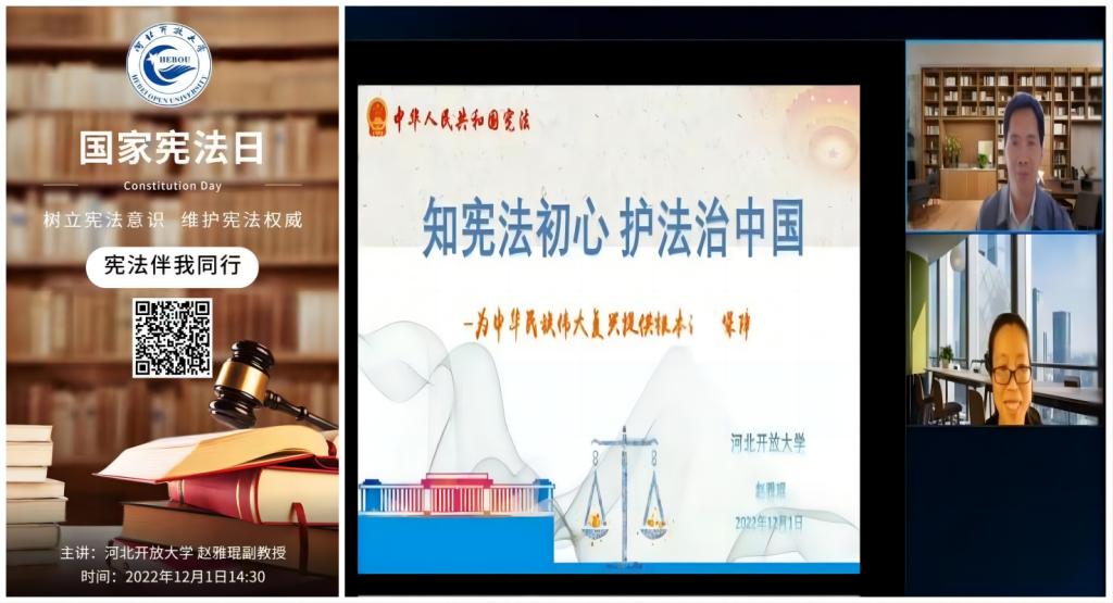 法治中國的建設,離不開每個公民的參與。為迎接2022年12月4日我國第九個國家憲法日,加強河北開放大學體系師生的法治宣傳教育,提高法治素養,樹立憲法意識,維護憲法權威,12月1日下午,教學支持部、科研與規劃處共同組織開展了憲法學習宣傳活動。活動由教學支持部法律系主任周麗副教授主持,科研與規劃處副處長趙雅琨副教授作了題為“知憲法初心,護法治中國”的講座。講座以線上直播方式舉行,河北開放大學體系內近千名師生在線收看。