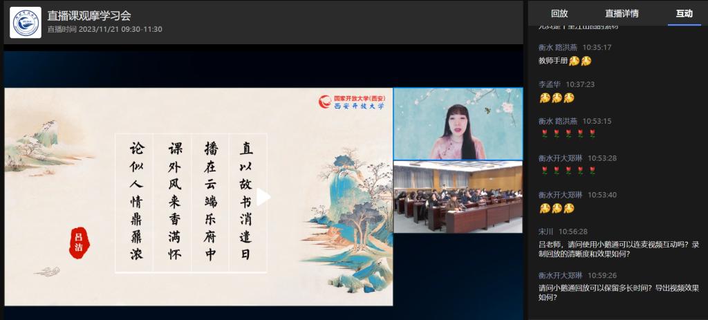 呂潔老師以美好的形象和唯美的PPT配合自創藏頭詩開始講座:“直以故書消遣日,播在云端樂府中。課外風來香滿懷,論似人情鼎鼎濃。”藏頭四字正是“直播課論”,足見她對直播教學的熱愛和深厚的經驗沉淀。隨后,呂潔老師按“博學之”“審問之”“慎思之”“篤行之”依次展開分享。“博學之”以《古代詩歌散文專題》課程教學內容為例,結合數段授課實況視頻,剖析國家開放大學遠程聽評課的評價標準,并提煉為專業知識譜系的審美化、可視化、趣味化;思政元素的如鹽入水、春風化雨、美美與共;數字技術的自主化、熟練化、多元化這三條寶貴經驗。“審問之”介紹“智慧學習質量監控與支持服務大數據平臺”,創新應用信息技術進行教學的審問、反思、改進。“慎思之”提及海報制作、問卷反饋,課程輔導團隊的信息服務、對學生的排名激勵,因類施教,個性化教學設計等,處處體現以學生為中心;“篤行之”強調找到屬于自己的教學風格,塑造其主體性,堅持、創新、反思,臻于至善。