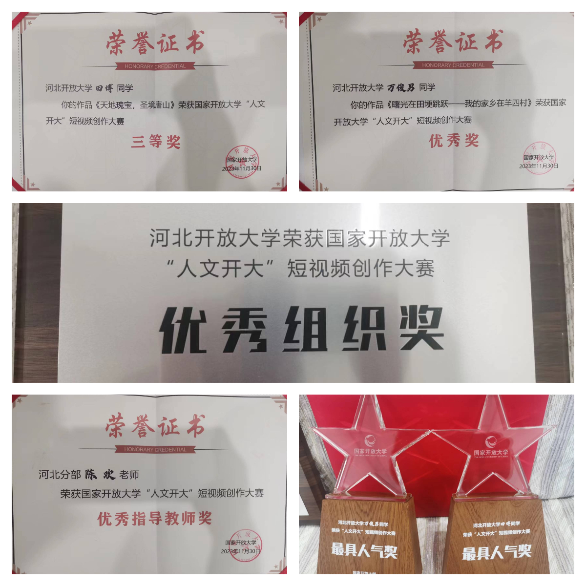 近日,國家開放大學面向體系舉辦的首屆“人文開大”短視頻創(chuàng)作大賽評選結(jié)果揭曉,我校2部作品獲獎,其中唐山開放大學田博同學創(chuàng)作的《天地瑰寶,圣境唐山》獲三等獎,滄州開放大學萬俊男同學創(chuàng)作的《曙光在田埂跳躍——我的家鄉(xiāng)在羊四村》獲優(yōu)秀獎,兩部作品同時獲得“最具人氣獎”。唐山開放大學陳歡老師獲得“優(yōu)秀指導教師”榮譽稱號,我校獲得“優(yōu)秀組織獎”。田博同學作為獲獎學生代表在頒獎活動中進行了交流發(fā)言。