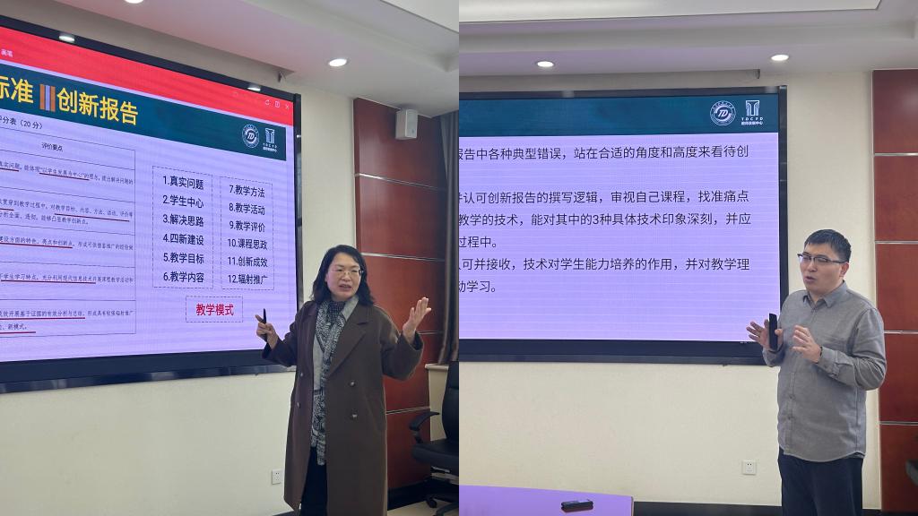 楊茜主任從評審的角度翔實全面地介紹了教創賽的基本情況,細致深刻地解讀了評分標準和底層邏輯,深度梳理了報告撰寫的注意事項,對備賽過程和材料準備給予了精準指導。張增強老師結合自身參加省賽及國賽的實戰經驗,聚焦備賽過程中存在的普遍誤區和具體問題,以豐富生動的正反實例進行了精彩的剖析和示范。