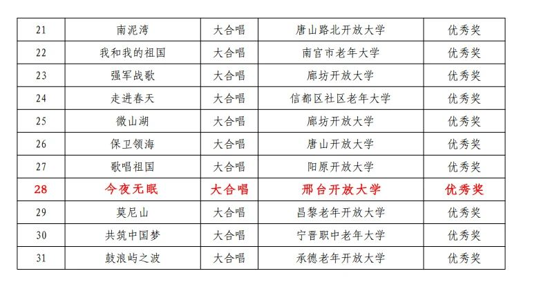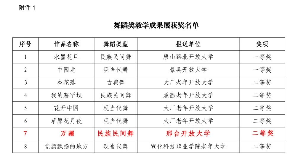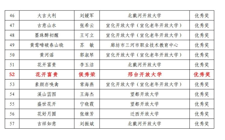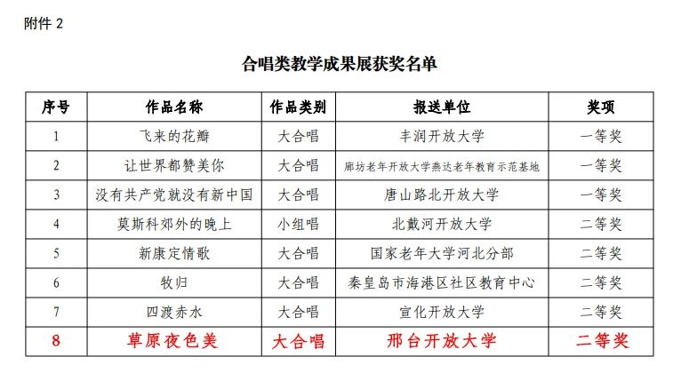 活動開展以來,邢臺開放大學積極響應,廣泛宣傳動員,共推薦各類作品88個,累計獲獎42項。其中,榮獲全國老年教育教學成果優秀獎1項;河北老年開放大學教學成果展41項(含優秀指導教師獎1項),包括舞蹈類2項(二等獎1項、優秀獎1項),合唱類6項(二等獎1項、三等獎1項、優秀獎4項),書畫類21項(二等獎4項、三等獎9項、優秀獎8項),器樂類3項(優秀獎3項),攝影類8項(二等獎2項、三等獎4項、優秀獎2項)。此次教學成果展示,是邢臺開放大學積極響應國家號召,大力推進老年教育普及和發展,不斷做實老年教育,提升老年教育質量和水平的一次集中展示。