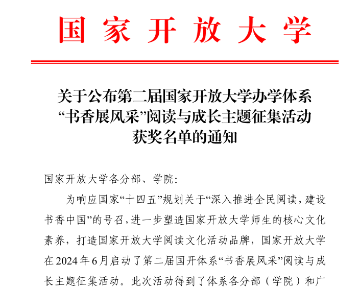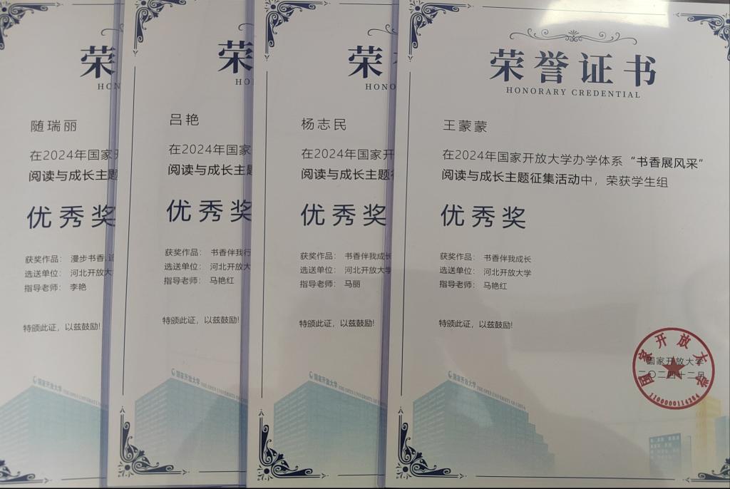 在國家開放大學第二屆國家開放大學辦學體系“書香展風采”閱讀與成長主題征集活動中,衡水開放大學廣大師生積極參與,表現出色,喜獲佳績,有四名同學榮獲學生組優秀獎,展現了學校師生的知識素養和文化底蘊。學生處因組織得力、成績顯著,被河北開放大學予以肯定表揚。
