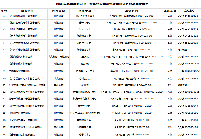 以下為本學期河北廣播電視大學網絡教學團隊直播教學安排,請各部門通知相關教師,組織學生積極參加。