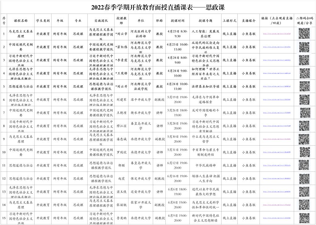 現將2022年春季學期面向河北開放大學體系思想政治理論課直播安排發給你們,請及時組織學生參加直播教學,把到課率作為評判日常學習行為的一項重要內容,切實發揮思政課立德樹人的關鍵作用。(注:附件中可直接點擊觀看地址或掃碼觀看。)