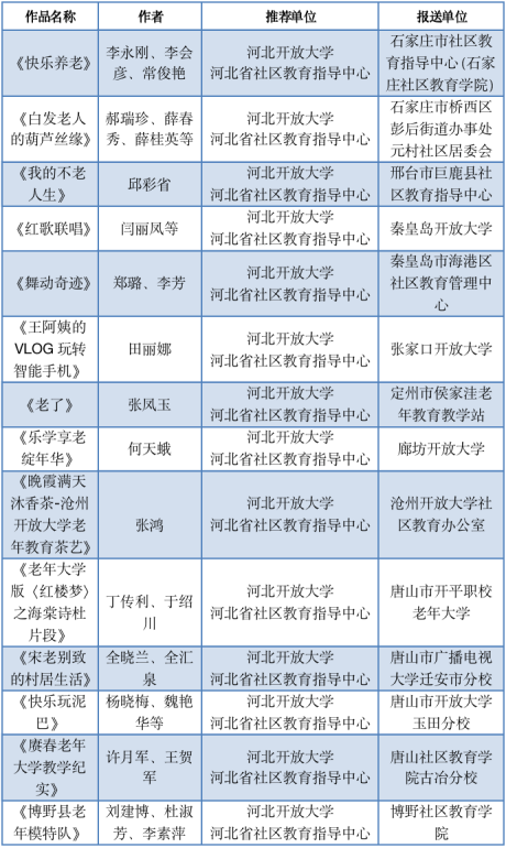 在全國老年教育教學成果展優秀獎評選中,除《我的智慧生活》被評為最佳故事獎三等獎外,來自河北省定州市侯家洼老年教育教學站的侯星老師和來自秦皇島市海港區社區教育管理中心的鄭璐老師被評為優秀指導教師。河北省社區教育指導中心、秦皇島市海港區社區教育管理中心、邢臺市巨鹿縣社區教育指導中心、保定市博野縣社區教育學院、承德老年開放大學被評為優秀組織單位。河北省社區教育指導中心推薦的14個作品榮獲優秀獎(詳見表1)。這些作品內容從各個方面展現了我省各地老年教育豐富多彩的特色課程內容和學員們豐碩的學習成果,呈現出學員們樂學享老的學習態度。河北省各地老年教育教學活動穩步推進,蓬勃發展,提高了老年人的社會參與度,活躍了老年人的生活,讓更多老年人實現了老有所學、老有所樂、老有所為。
