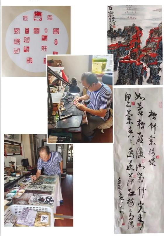 熊守志老人是地道的秦皇島老人,退休后一直義務擔任街道社區的藝術志愿教師。早期秦皇島文聯會員,現兼職海港區社區教育書畫聯誼會副會長,海港區文聯美協理士,戰友書畫院院士,開發區美協副秘書長。這幾年疫情防控期間,老人將社區里近100位退休人員組織在一起創建了微信課堂,開展防疫網絡學習模式,通過這種線上的方式,積極傳播衛生健康常識和藝術文化交流。同時,熊守志老人堅持每天都篆刻印章,傳遞正能量,傳播社區最美聲音。