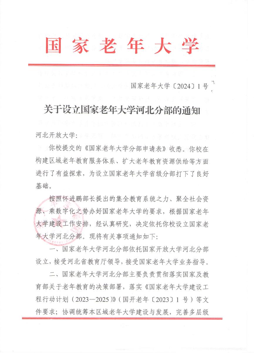 2021年9月河北開(kāi)放大學(xué)成立河北老年開(kāi)放大學(xué),開(kāi)展實(shí)行實(shí)體教學(xué)班和網(wǎng)絡(luò)教學(xué)班有效融合、線上自主學(xué)習(xí)與線下體驗(yàn)學(xué)習(xí)相結(jié)合的老年教育模式探索。2023年線上開(kāi)設(shè)25個(gè)班次,線下47個(gè)班次,服務(wù)3768人次。全省老年開(kāi)放大學(xué)體系學(xué)員人數(shù)超過(guò)13萬(wàn)。2024年1月8日,國(guó)家老年大學(xué)下發(fā)《關(guān)于設(shè)立國(guó)家老年大學(xué)河北分部的通知》,正式批復(fù)河北開(kāi)放大學(xué)成立國(guó)家老年大學(xué)河北分部。學(xué)校將在河北省教育廳的領(lǐng)導(dǎo)下,接受?chē)?guó)家老年大學(xué)業(yè)務(wù)指導(dǎo),協(xié)調(diào)統(tǒng)籌全省老年教育發(fā)展,不斷滿(mǎn)足老年學(xué)員多樣化學(xué)習(xí)需求,推進(jìn)河北老年教育高質(zhì)量發(fā)展。
